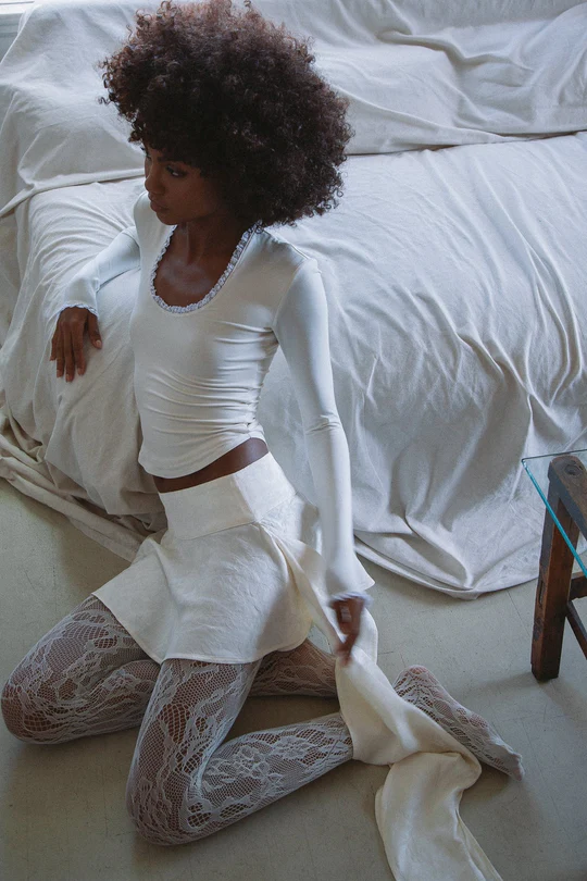 Made from our buttery soft Tencel-jersey and decorated with a vintage cotton trim, the Nero will be your new go-to top. Featuring a deep scoop neckline, slim long sleeves, and a slightly curved hem, this top pairs will with denim and fancy skirts alike.